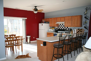 The kitchen appliances haven't changed, but the paint job has and so has the furniture. I have added five bar chairs, a table and chairs set, and a decorative iron wine rack on the wall.
