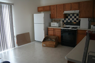 The kitchen appliances haven't changed, but the paint job has and so has the furniture. I have added five bar chairs, a table and chairs set, and a decorative iron wine rack on the wall.